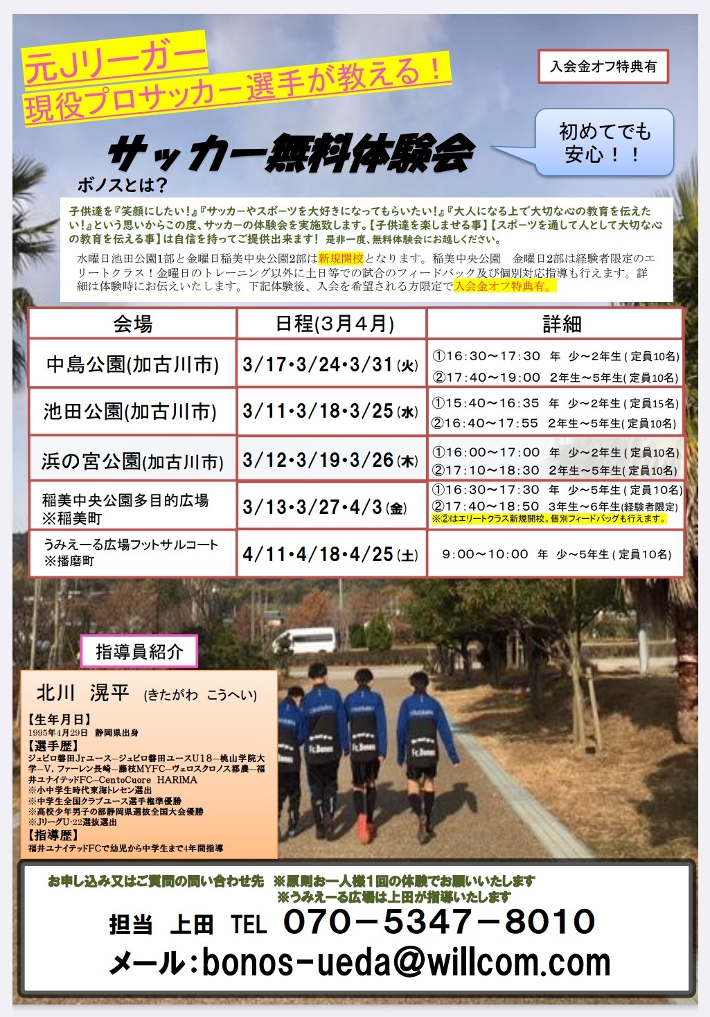3月4月にデータ内の会場にてサッカー体験会を開催いたします。